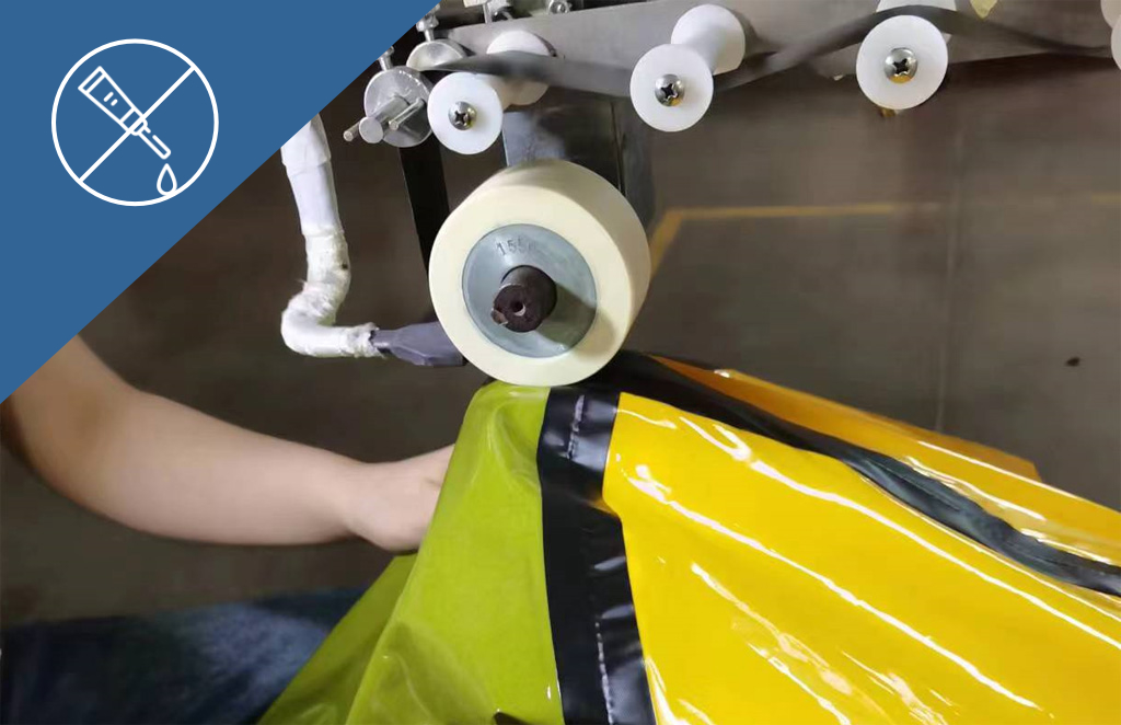 Using high temperature- or radio frequency welding, TPU will deform and reliably fuse to itself (unlike rubber, for example) making an extremely strong bond. Since no additional elements like glue are needed, this also saves additional weight. For the sake of the environment, we completely dispense with adhesives in the production process.
